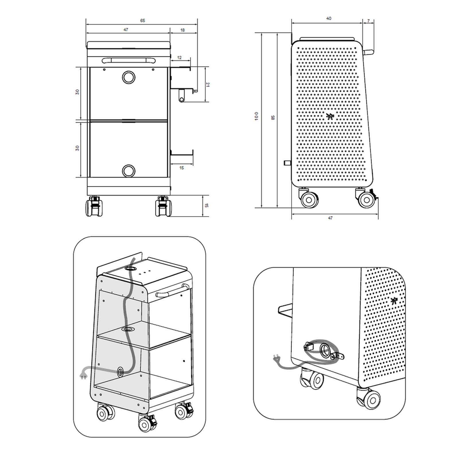 Im täglichen Einsatz überzeugt der Wagen durch seine durchdachte Aufteilung. Seitliche Ablageflächen bieten zusätzlichen Platz für Zubehör und Arbeitsmaterialien, sodass alles Wichtige schnell erreichbar bleibt. Das integrierte Kabelmanagement-System sorgt für eine saubere Führung technischer Anschlüsse, verhindert Kabelsalat und trägt gleichzeitig zu mehr Sicherheit sowie einer hygienischen Arbeitsumgebung bei. Die glatten Oberflächen unterstützen zudem eine schnelle und unkomplizierte Reinigung.